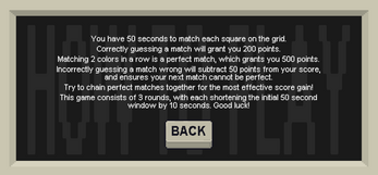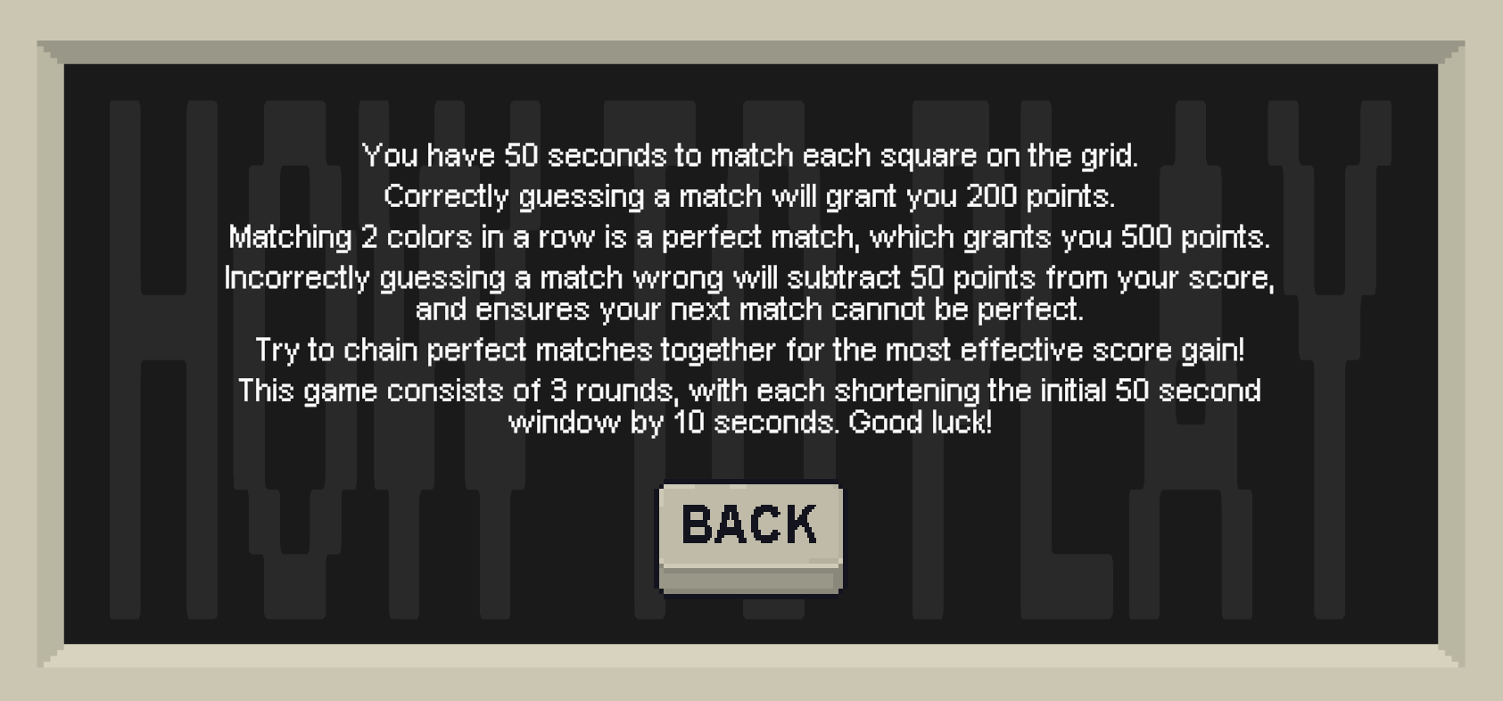 A simple color matching game. Accrue the most amount of score that you can across three timed rounds!