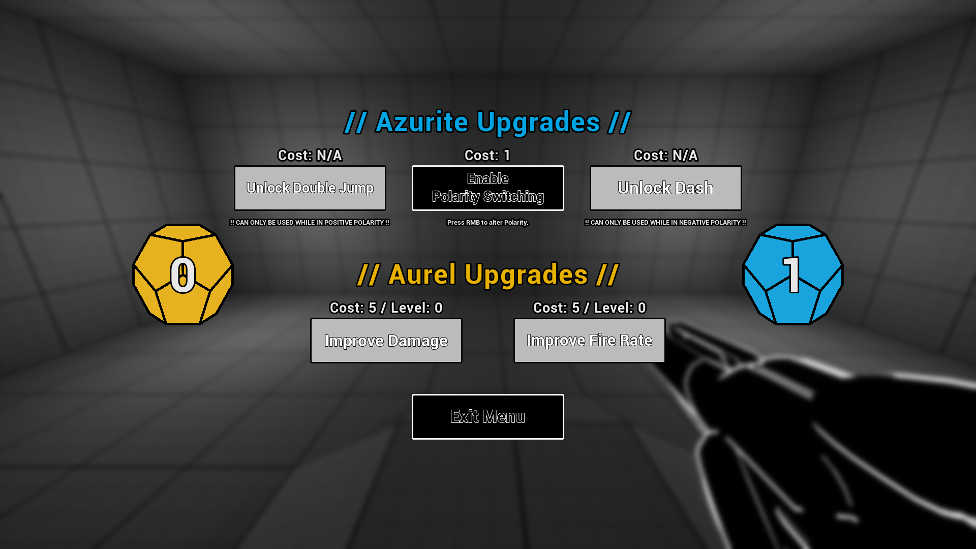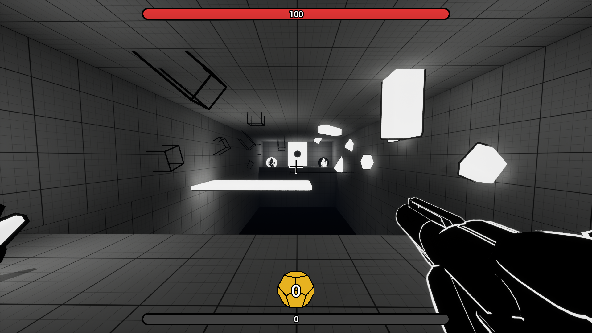 An FPS puzzle platformer. Shoot crystals with the matching weapon type to destroy them faster, and collect the currency they drop to buy abilities and upgrade your weapons.